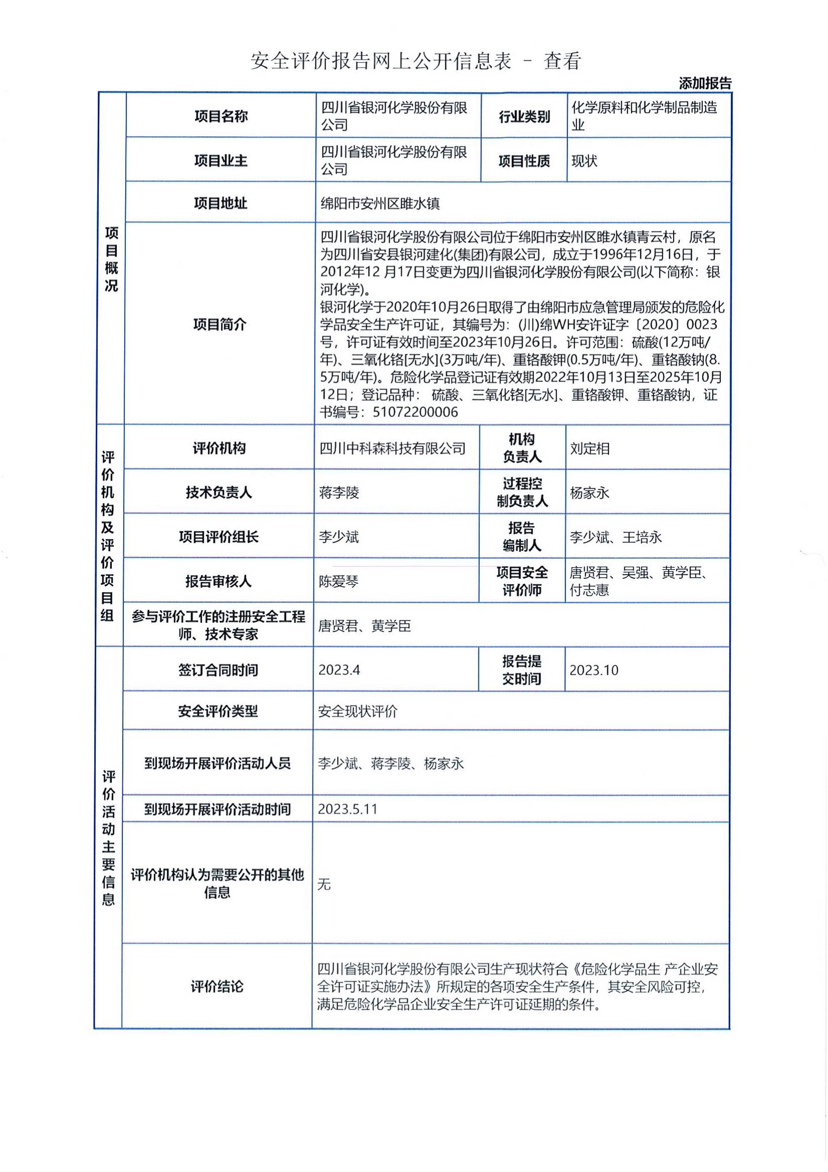 四川省银河化学股份有限公司委托我司进行安全现场评价,我司于2023年5月组织评价人员进场实地勘察和收集资料,本报告根据本项目的实际特点,分析评价其存在的危险、有害因素的种类和发展规律,定性定量评价危险、有害程度,提出了安全对策措施及建议,作出安全评价结论。根据《安全评价通则》《危险化学品生产企业安全评价导则(试行)》,结合《四川省危险化学品生产企业安全生产许可证实施细则》的相关要求,编制完成了《四川省银河化学股份有限公司安全现状评价报告》。