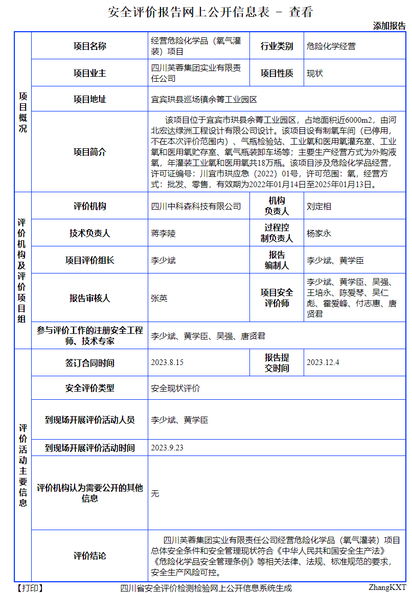评价小组在确定评价对象和明确评价范围后,收集有关资料,深入现场进行核查,审阅有关资料,依据有关标准对该项目进行危险有害因素识别与分析,定性、定量分析危险、有害因素的程度,提出合理可行的安全对策措施及建议。按照《安全评价通则》及相关规范要求,编制完成了《四川芙蓉集团实业有限责任公司经营危险化学品(氧气灌装)项目安全现状评价报告》。
