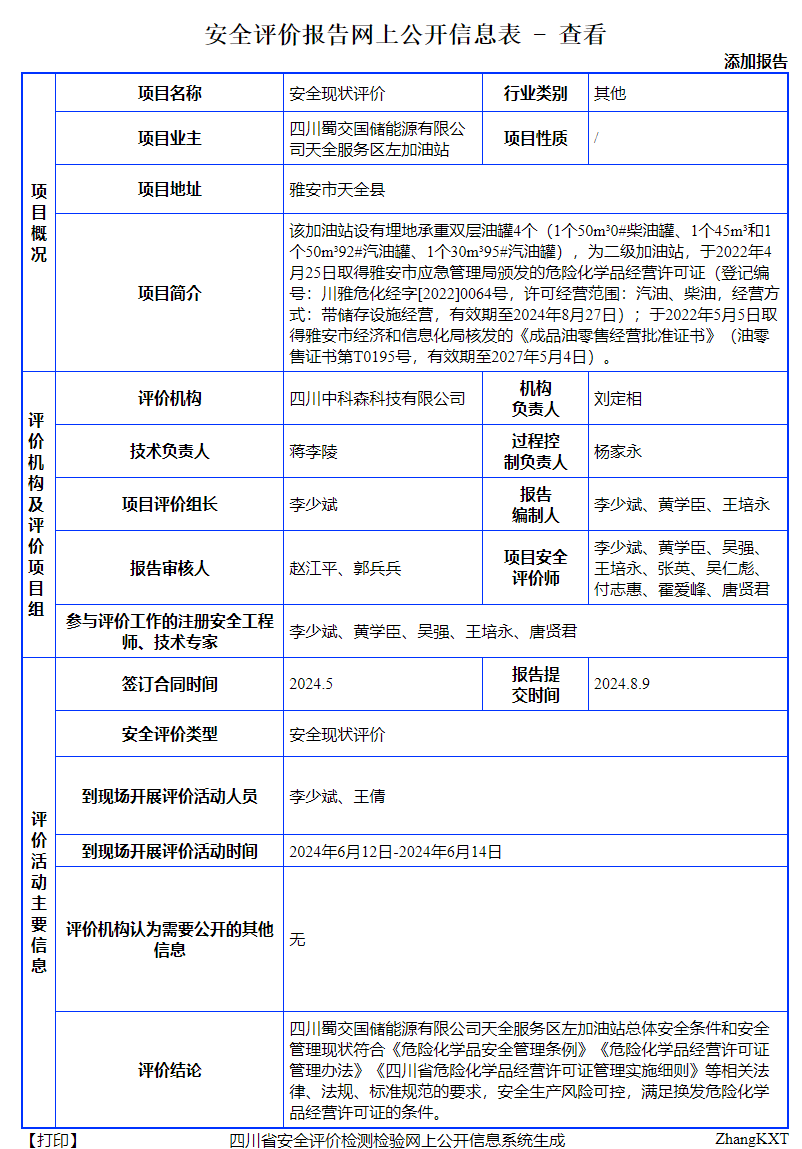 四川蜀交国储能源有限公司委托我公司对该加油站进行安全现状评价。我公司接受委托后,成立了项目组,在加油站相关人员的陪同下,于2024年6月12日进行现场调研,在资料收集、整理、分析的基础上,严格遵循《安全评价通则》及《危险化学品经营单位安全评价导则(试行)》(安监管管二字[2003]38号)的要求编写完成了《四川蜀交国储能源有限公司天全服务区左加油站安全现状评价报告》。