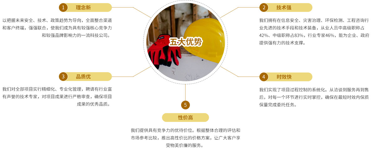 公司秉承安全、经济、高效、先进的原则,为政府部门、企事业单位提供安全预评价、安全现状评价、安全验收评价、安全专项评价、安全设施设计、安全风险评估、应急管理、安全标准化、安全检查(隐患排查治理)等各类技术咨询、服务,为各行业提供各类灾害治理技术咨询和安全生产技术托管服务。